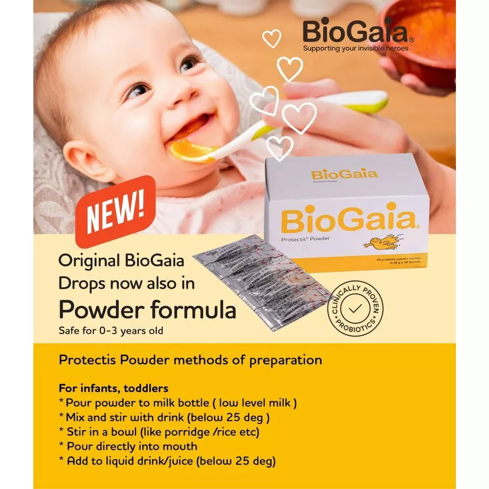 Serbuk BioGaia Protectis adalah serbuk probiotik yang boleh digunakan dalam semua makanan dan minuman sejuk. Pentadbiran yang memastikan bahawa seluruh keluarga kekal mudah dilindungi daripada jangkitan tanpa mengira sama ada mereka sensitif terhadap pemanis atau keadaan tertentu, atau jika mereka mengalami kesukaran menelan pil. Serbuk boleh sama ada ditabur pada makanan, dicampur ke dalam minuman atau dibawa terus ke dalam mulut.