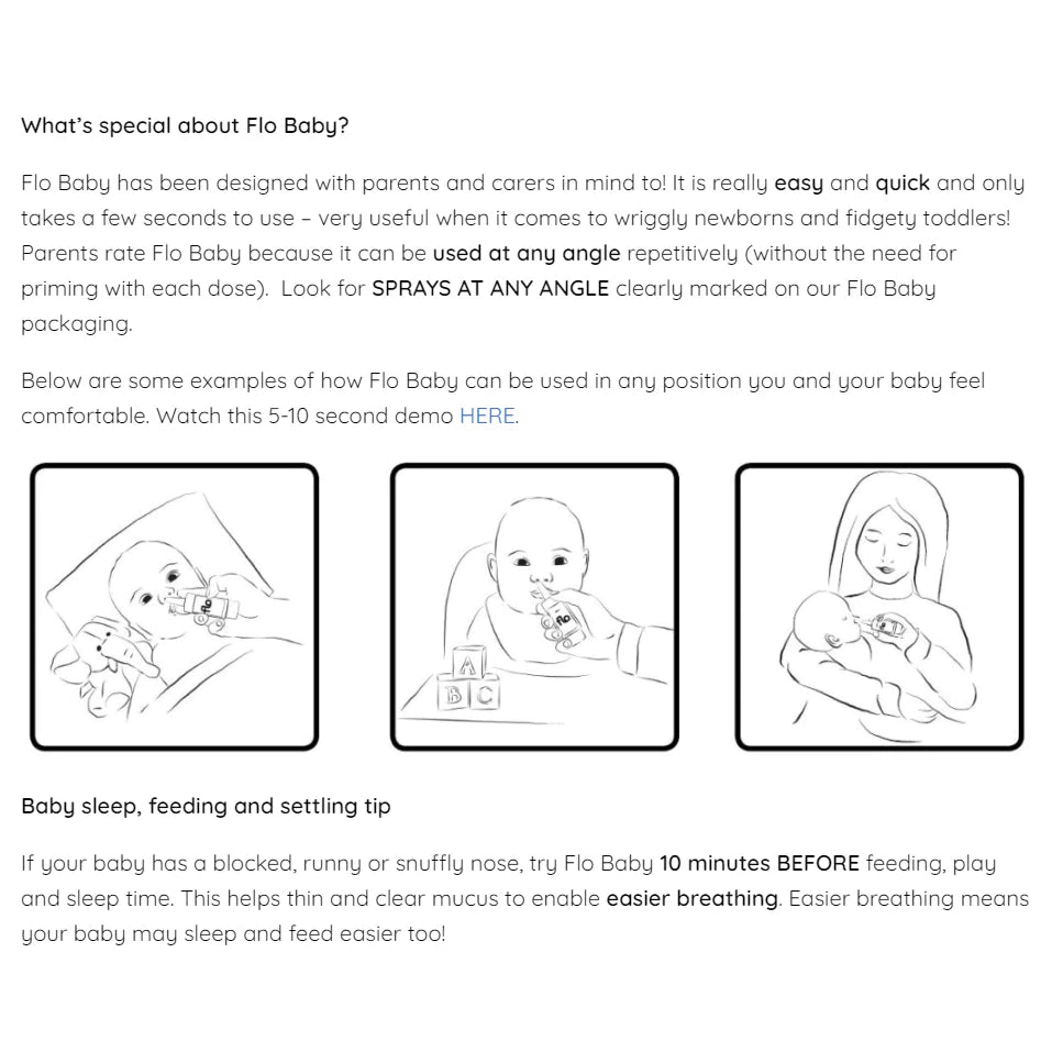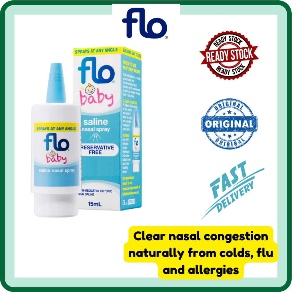 Flo Baby Saline Nasal Spray helps clear a baby‘s runny or blocked nose quickly, gently and easily. It delivers a gentle, non-medicated, preservative-free nasal saline that is suitable for daily use.